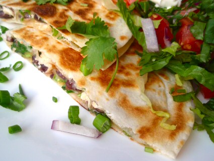 3. Heat a griddle, indoor grill (like Foreman), or heavy skillet over medium heat. Place folded quesadillas in pan or on griddle and heat for a couple minutes on each side, until filling is hot, cheese inside is melted, and outsides are browned. Turn down the heat if they’re browning too quickly, or turn up the heat if they’re getting hot inside but not crisp and browned on the outside.