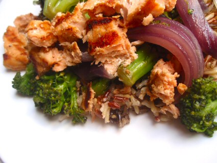 Chunks of flaky grilled salmon, crisp-tender broccoli florets, and onion wedges tossed together with a hint of flavor and sweetness from maple syrup, served over hot cooked rice!