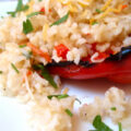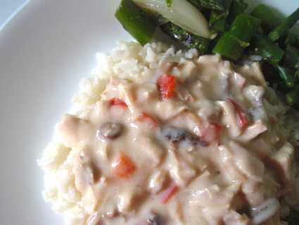 A creamy chicken gravy with peppers and mushrooms, served over hot rice
