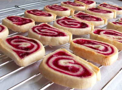Vanilla shortbread cookie dough, rolled and filled with homemade cranberry sauce; frozen and then sliced and baked