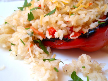 3. To serve, place the grilled pepper halves on plates and stuff with (or spoon in) the fried rice mixture. Top with fresh cilantro, green onions, shredded cheese, and hot sauce. Enjoy!