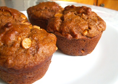 Sweet and spicy pumpkin muffins with a crusty top and butterscotch chips sprinkled throughout