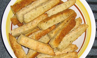 4. Lay dough in pre-heated 9×13-inch pan, atop the melted butter/oil. Cut into 1/2″ strips. Bake at 425 degrees for 20 minutes.