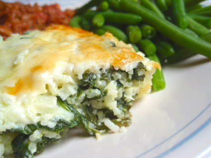 2. In a large mixing bowl, combine all other ingredients. Add the wilted spinach and stir. Pour into a greased 8×8-inch square baking dish.